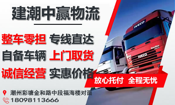 潮州到池州物流专线是建潮中赢物流主营重点物流线路之一,提供4.2-17.5米整车包车运输,零担专线,可上门取货,量大免费提送货;潮州到池州货运专线价格实惠,欢迎来电咨询。